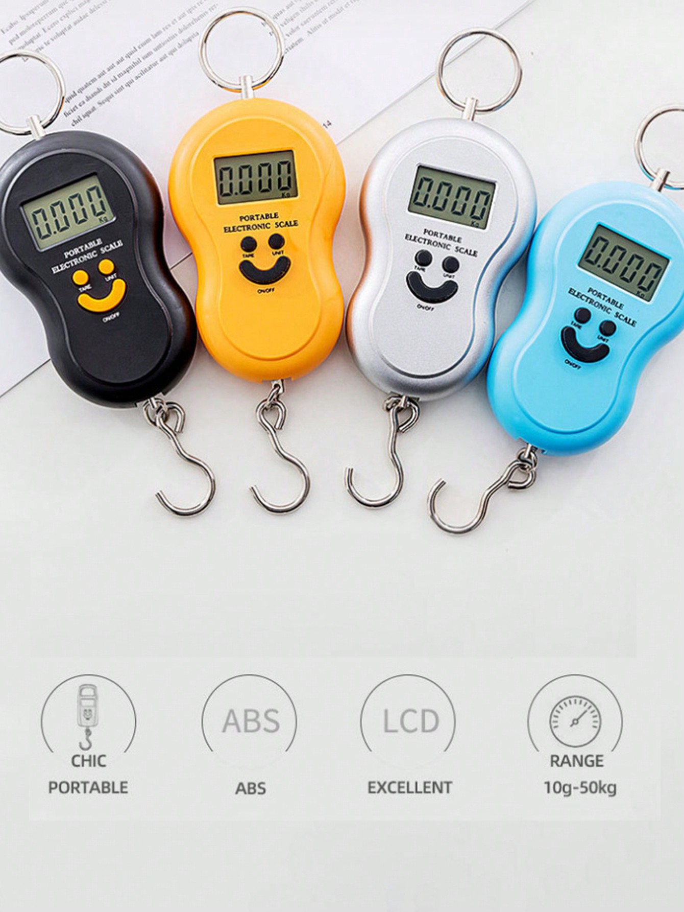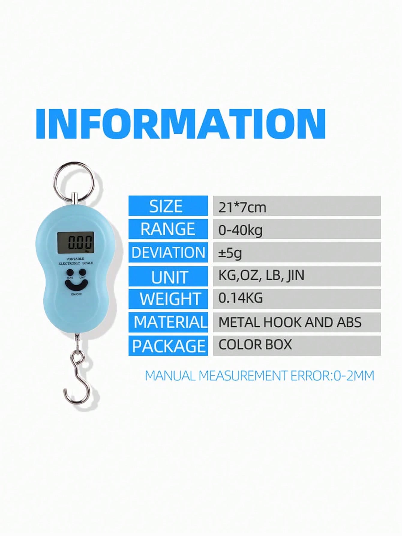 Couleur: couleur aléatoire • Taille : 18,2 x 7,3 x 2,2 cm (L x L x H) • Batterie : 2 piles AAA (non incluses) • Capacité de charge : 50 kg • Plage d'erreur : ±5~10d • Unité de poids : kg, lb, jin, oz (1 kg = 2,2 lb = 2 jin = 35 oz) • Affichage : LCD • Grand écran LCD facile à lire • Faible consommation d'énergie, batterie faible • La balance s'éteint automatiquement lorsqu'elle n'est pas utilisée pour économiser de l'énergie • Appuyez sur le bouton TARE pendant 2-3 secondes pour activer ou désactiver la fonction « LOCK ».