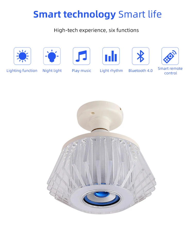 Durable : matériau de haute qualité utilisé. • Système Bluetooth intégré : permet de lire ses fichiers audio MP3 préférés. • Ampoule à changement de couleur : facile à créer une atmosphère de fête/nécessaire. • Installation facile : conception simple à brancher. • Design unique : Crystal Design pour une ambiance parfaite et vibrante. Caractéristiques: • Matériau : Tête en aluminium moulé sous pression + Couvercle en plastique • Dimensions du produit : environ 9,3 × 11,5 centimètres • Longueur de la télécommande : environ 13 centimètres • Puissance : 24 W • Tension : 190-265 V • Température de couleur : 2 700 K-7 000 K • Tension de la télécommande : 3 V