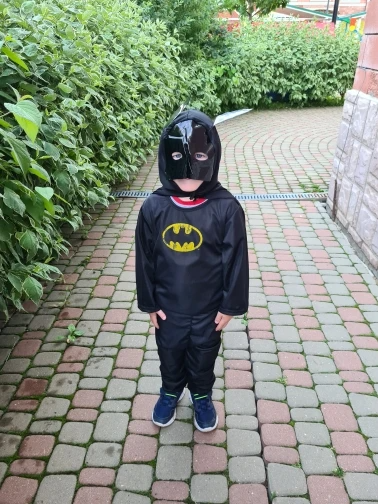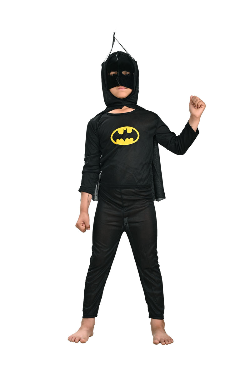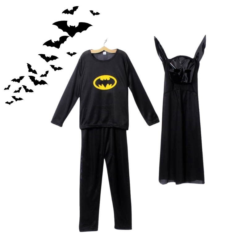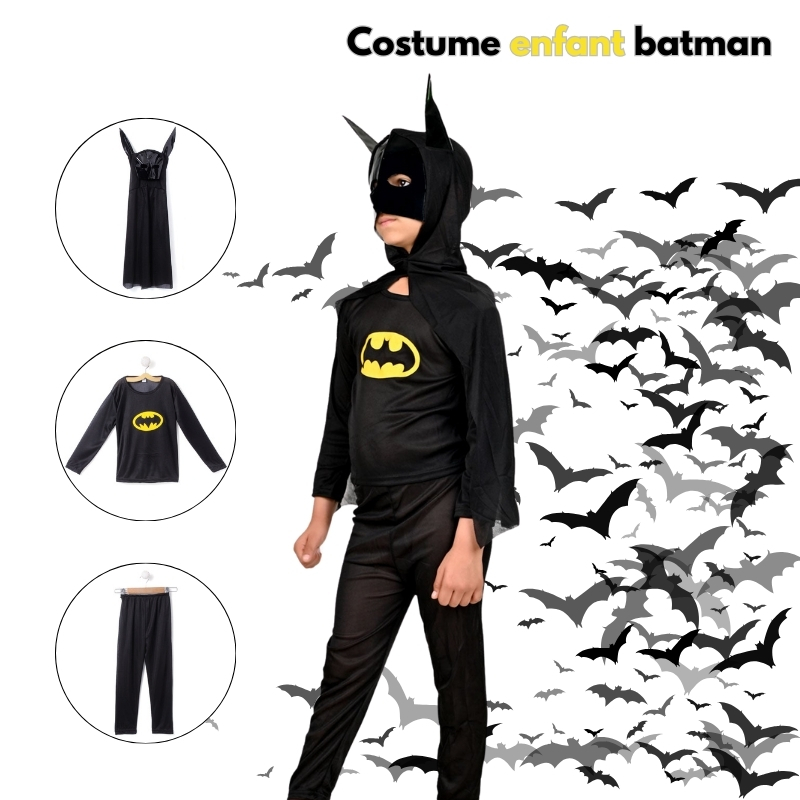 AGE : 3 ans jusqu'a 6 ans selon les proportions de l'enfant • Contenu du costume : • -Un T-shirt Batman noir • -Un pantalon noir • - Un masque facial • -Une robe noire • Matériau : polyester fin.