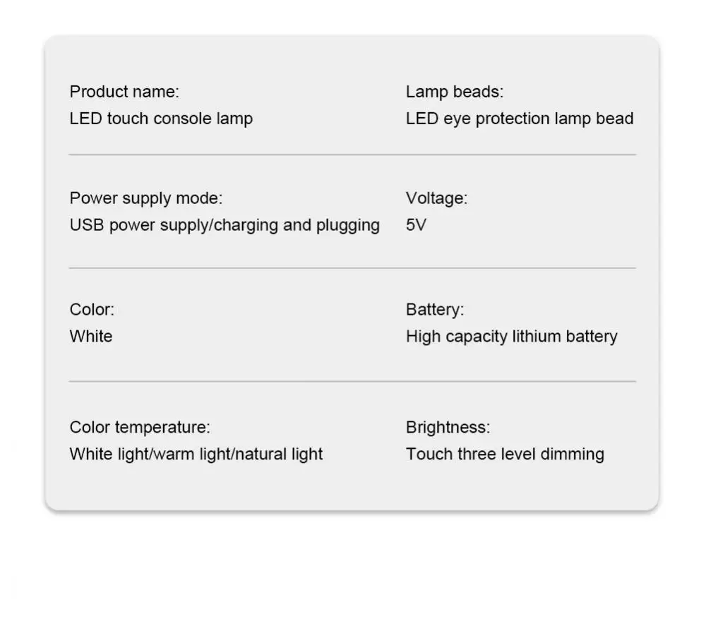 Description: • Nom: lampe de table LED à intensité variable • Mode de commutation: gradation tactile à 3 niveaux (lumière chaude, lumière blanche, lumière naturelle) • Réglage multi-angle: le capuchon de la lampe est tourné de haut en bas à 180 ° et incliné vers l'avant à 90 ° • Température de couleur: lumière blanche 6500K, lumière chaude 3000K, lumière naturelle 3000K-6500K • Tension: 5v • Capacité de la batterie: 4000mAh, 4800mAh, 6000mAh Caractéristiques: • La lampe de bureau de 【fonction d'éclairage et de mémoire de 【comporte 3 modes de couleur avec 3 niveaux d'éclat pour le travail, l'étude, la lecture, ou se détendre. Avec la fonction de mémoire intelligente pour mémoriser la luminosité de la lumière, libre de régler et facile à garder le réglage personnel. • 【Port de chargement USB pratique et économe en énergie 】 dans la base des lampes de bureau, un Port USB est facile à charger vos appareils à portée de main (adaptateur et câble USB inclus). Perles led de haute qualité et corps de lampe en aluminium pour une dissipation thermique plus économe en énergie et efficace. • Distribution de lumière d'eye-care et uniforme de 】 avec l'éclairage mou et sans scintillement, cette lampe de bureau protège contre la fatigue d'oeil provoquée par la lumière vacillante et l'éblouissement dur. Sa polyvalence lui permet de fonctionner comme une lampe de bureau, une lampe de lecture, ou même une lampe de travail portable pour la maison, le bureau ou la chambre de dortoir. • Ajustements multi-angles de ★ et économie d'espace notre lampe de bureau de led avec le bras réglable de 180 ° et la base tournante d'axe de 90 ° pour un éclairage plus flexible, qui ciblent l'éclairage où que vous travailliez sans accabler le bureau. Forfait inclus: • 1x lampe de bureau • 1x câble d'usb