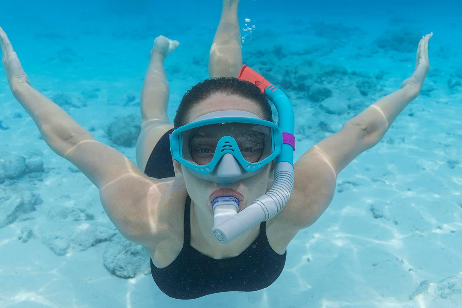 تقنية الحماية من الرذاذ (Splash-guard): مزود بنظام متطور يمنع دخول الماء إلى أنبوب التنفس (السنوركل)، مع صمام تفريغ يسهل طرد أي مياه زائدة، مما يضمن لك تنفساً آمناً ومستمراً.