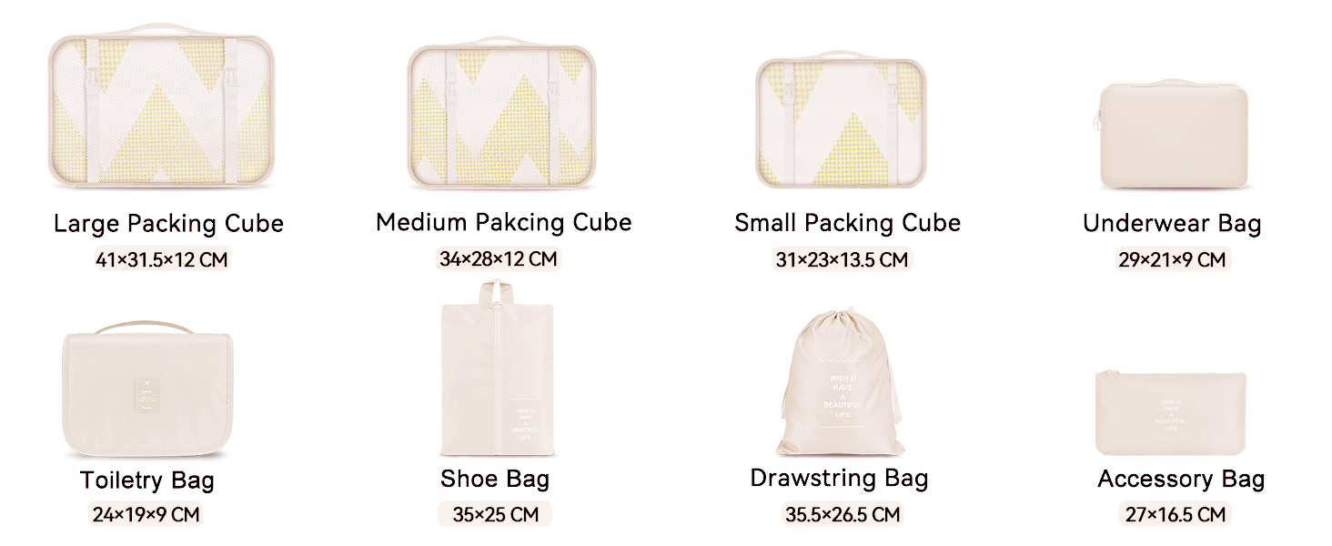 نظام 8 في 1 متكامل: تغطي المجموعة كافة أنواع الأمتعة؛ حقائب كبيرة للكنزات والبنطلونات، حقائب متوسطة للمناشف والملابس الداخلية، حقائب مخصصة للأحذية والجوارب، بالإضافة إلى حقيبة مستحضرات تجميل محمولة وقابلة للتعليق.