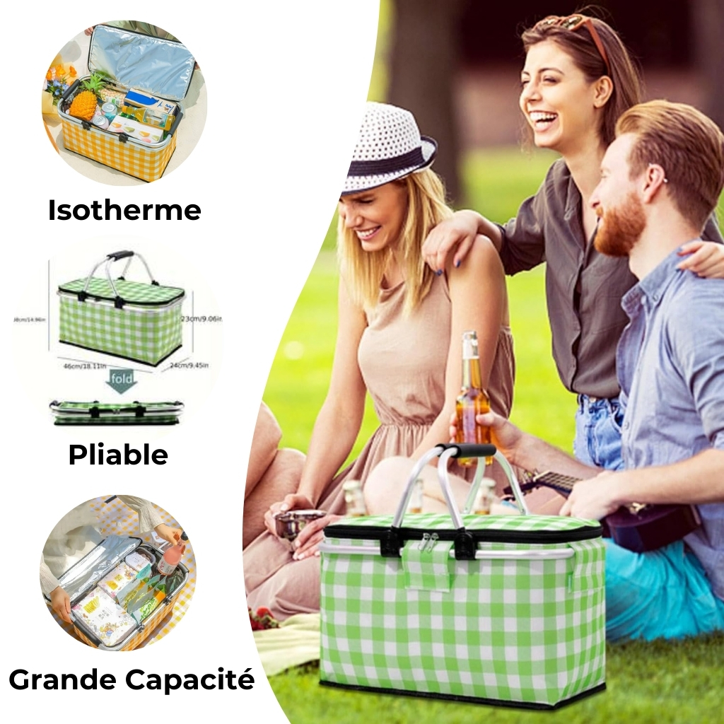 Panier de pique-nique a isolation thermique pliable portable avec couvercle et poignée en aluminium