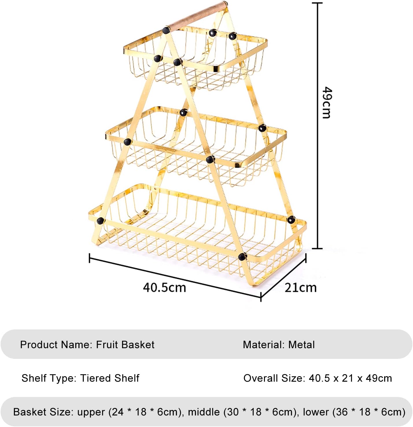 【Panier de comptoir à 3 niveaux 】 la conception à 3 niveaux du support de stockage de fruits peut contenir beaucoup de fruits et légumes. Vous pouvez facilement séparer vos fruits et légumes sans les empiler les uns sur les autres. Des paniers de différentes tailles font que l’ensemble du panier de rangement a un effet superposé. • 【Conception détachable】 le panier de rangement est détachable et peut être utilisé séparément ou en combinaison. Le panier de rangement peut être détaché pour être rangé lorsqu’il n’est pas utilisé, ce qui peut vous faire gagner de l’espace et n’occupera pas d’autres espaces supplémentaires. • 【Panier multifonctionnel 】 ce panier de fruits et légumes peut non seulement être utilisé pour placer des fruits et légumes à la maison, mais peut également être utilisé pour stocker du pain, des collations, des bouteilles d’assaisonnement, des livres, etc. • 【Matériau de haute qualité】 la corbeille à fruits est en fer, antirouille et étanche. Il y a une poignée en bois sur le dessus pour un transport facile. La structure ouverte permet une circulation plus libre de l’air et garde les fruits et légumes frais. • 【Économisez de l’espace 】 le panier est parfait pour contenir à la fois des fruits et des légumes, garder votre espace organisé et ne prend pas trop de place sur le comptoir. Une solution parfaite pour le stockage familial et extérieur.