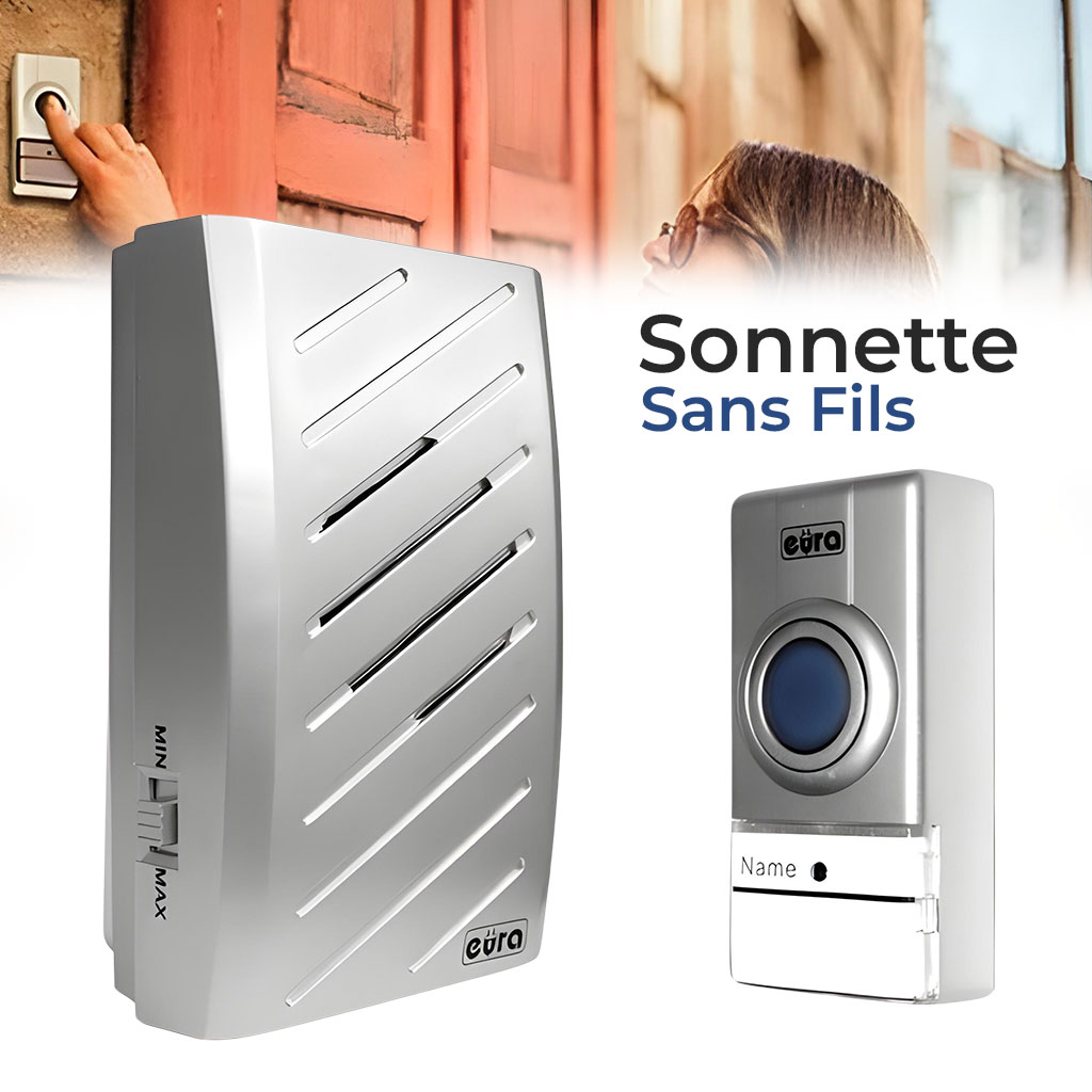 Sonnette sans fil - caractéristiques : • - alimentation ~230V/50Hz directement depuis la prise de courant domestique • – ne nécessite pas d’installation supplémentaire • - bouton alimenté par pile • - 16 sons au choix, sélection du son via bouton à l'intérieur de l'émetteur • - système de codage de cloche et de bouton • - possibilité d'agrandir l'ensemble avec des éléments supplémentaires (système EURA-BELL) • - facilité d'utilisation et de montage • - ne nécessite pas de connexion par câble • - plage de fonctionnement min. 50m en zone ouverte • - la transmission n'interfère pas avec le fonctionnement d'autres appareils • - la technologie numérique utilisée dans le bouton de la sonnette prolonge considérablement la durée de vie de la batterie • - Design moderne • - faible consommation d'énergie • - pile pour le bouton (émetteur) incluse • - bouton/émetteur étanche