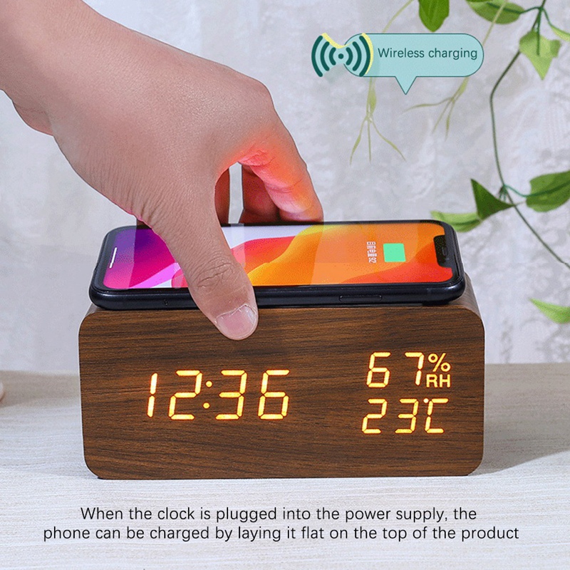 Réveil numérique de bureau en bois avec socle de charge sans fil Qi