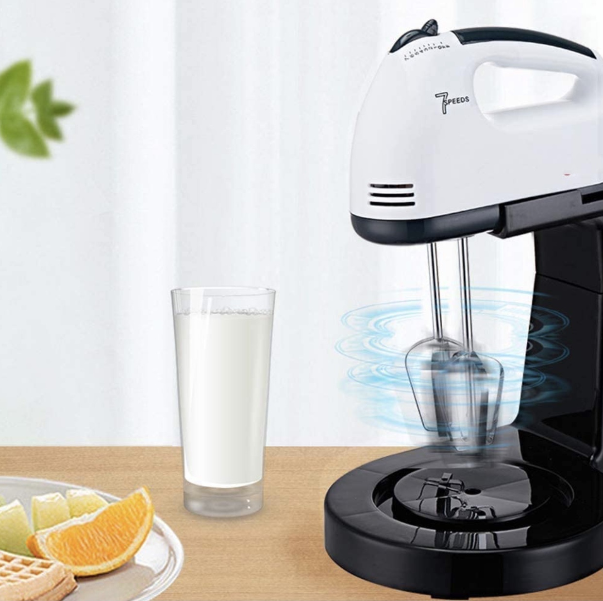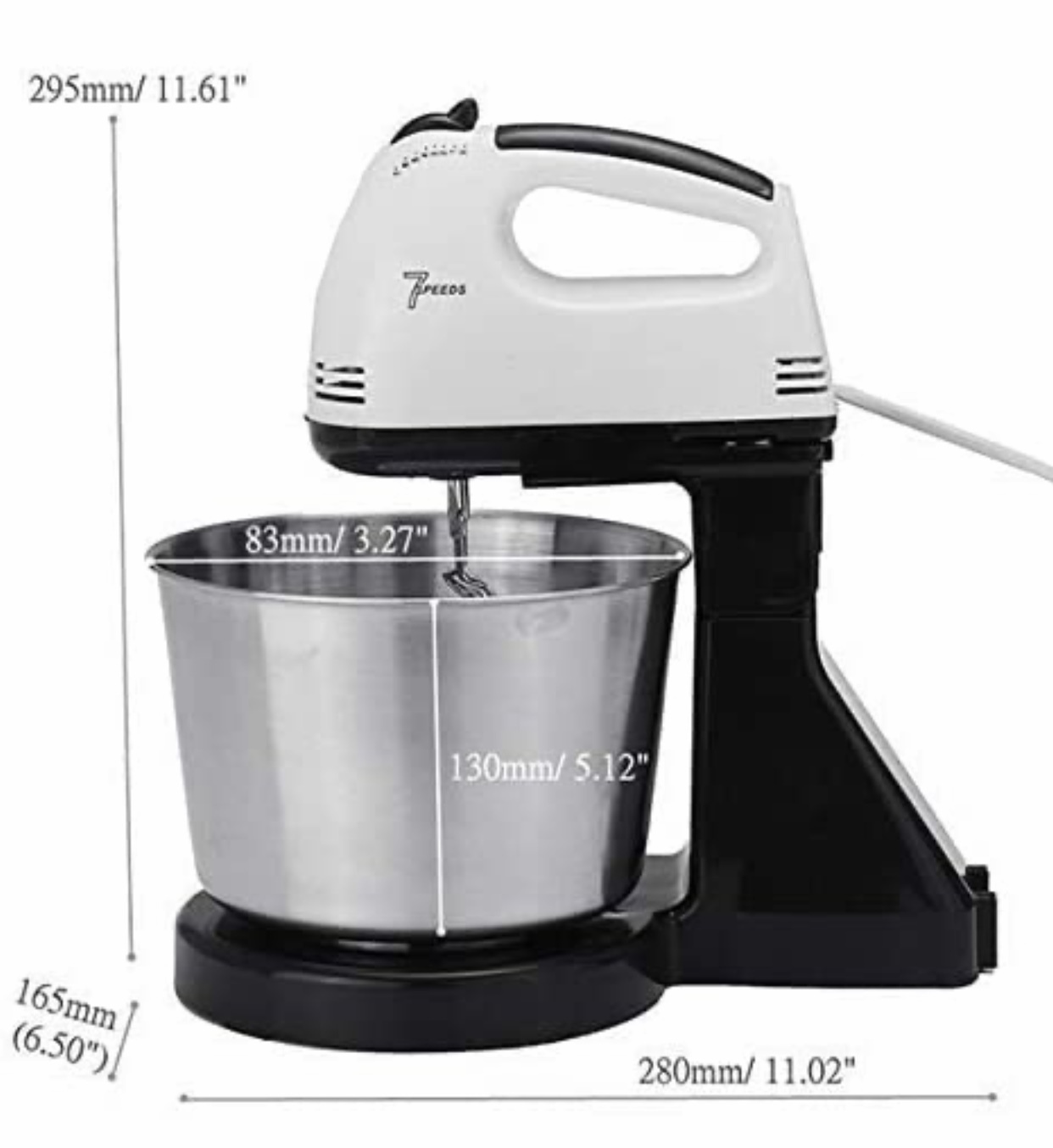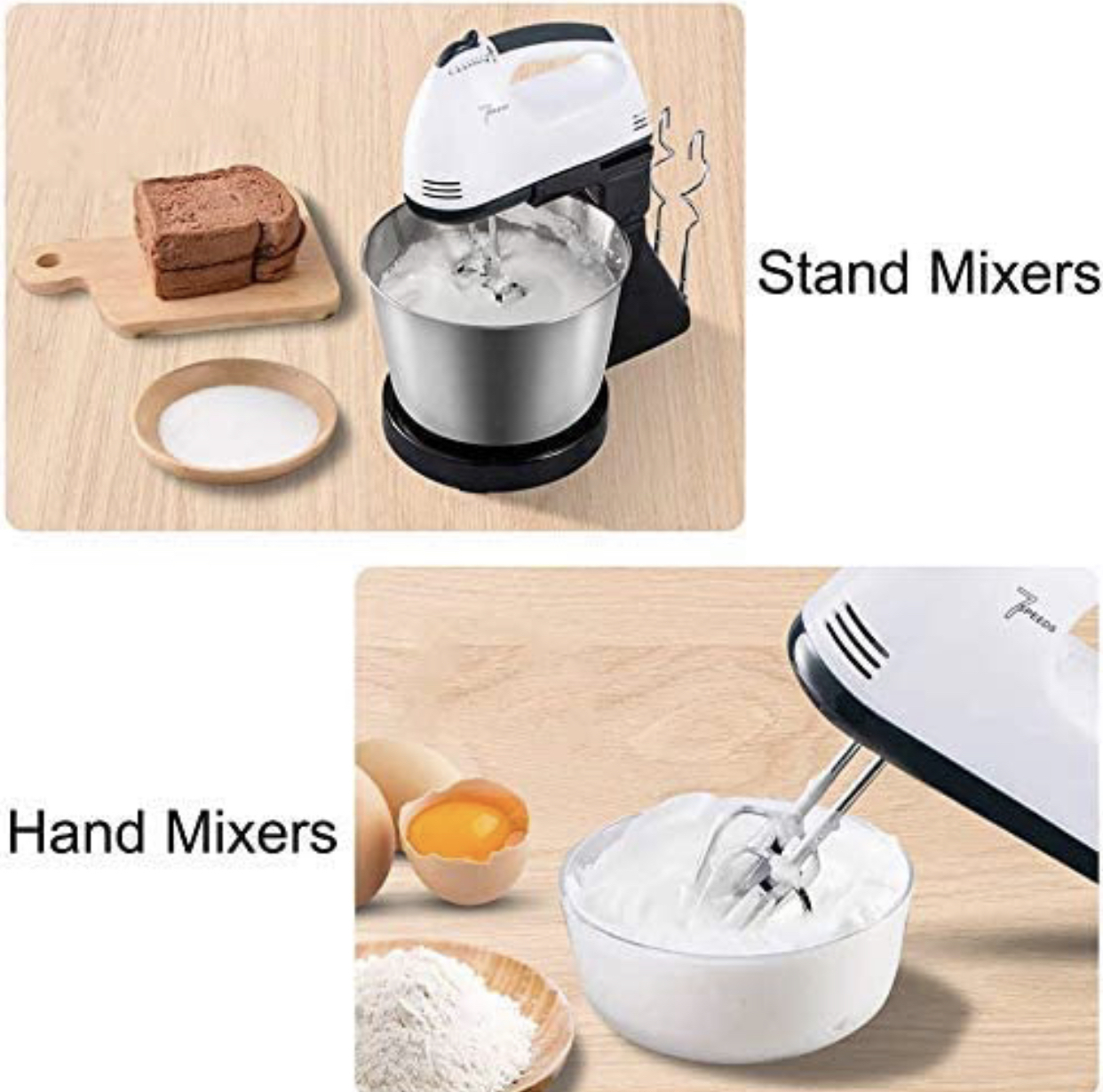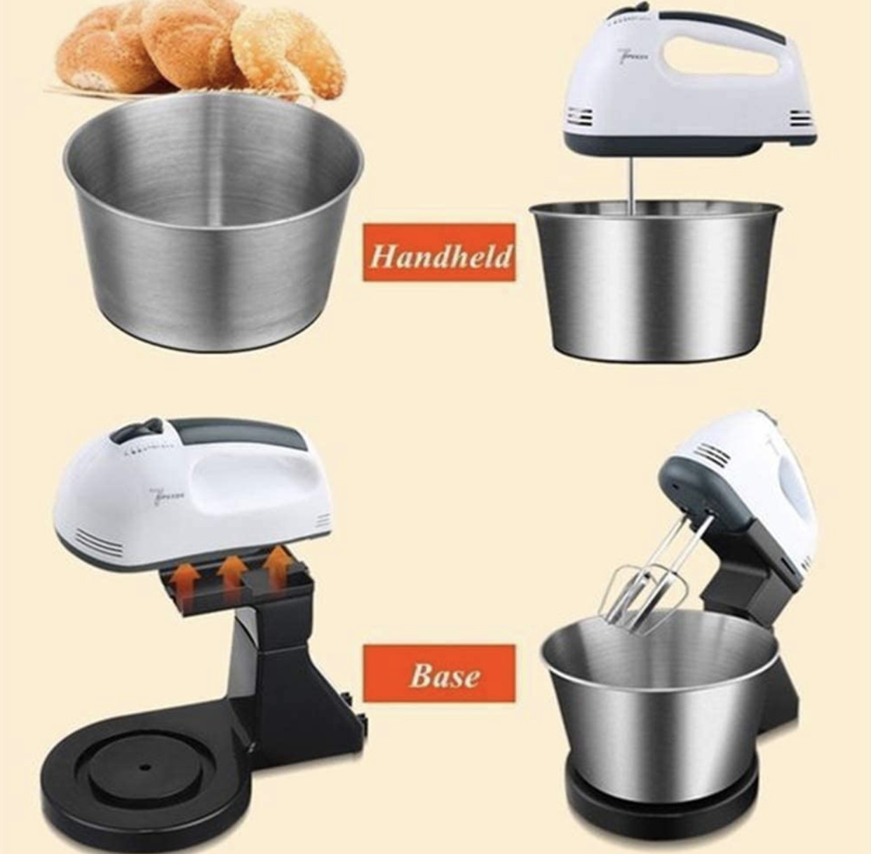 Material : Plastic + Stainless Steel . • Plug Type : EU Plug Rated . • Voltage : 220V Rated . • Frequency : 50Hz Rated . • Power : 200 Watt/ 7 Speeds • Capacity : 2 L Bowl • Features : Portable, Handheld, Multifunctional, Easy to Use, Kitchen Utensil. • Mixer Overall Size : 280 x 165 x 295mm/11.02 x 6.50 x 11.61" (Approx.) • Bowl Diameter: 83mm/3.27" (Approx.) Bowl Height: 130mm/5.12" (Approx.) • Hand Mixers are reliable small appliances for all your baking and cooking needs. • These lightweight mixers are designed for power with 7 speeds that are ideal for mixing, stirring, beating and whipping. Models come equipped with traditional chrome beaters for optimal mixing. • Whether you're mixing ingredients for baking or beating eggs for omelettes, our hand mixers make preparation easy and save you valuable time in the kitchen. • [7-Speeds Switch]:With 7-speed electric egg beater, you are easy and free to make foods what you want.With multi-directional cold and hot air convection heat dissipation. The hand mixer is made of stainless steel and premium plastic, lightweight,You can enjoy your works. • Comfortable Stand. • Removable Bowl. • Beaters release button. • 2 beaters for eggs & Cream. • 2 Dough hooks for mixing dough