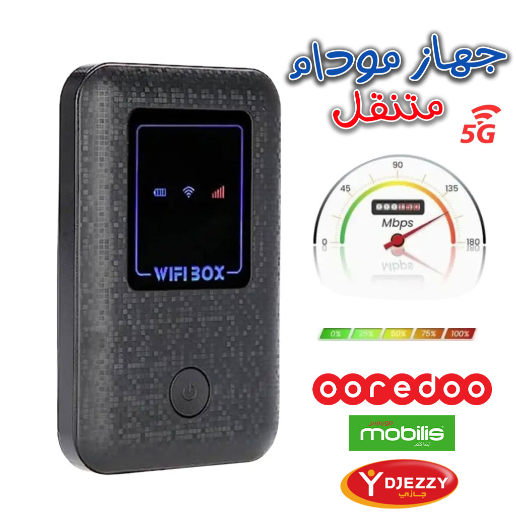 Avec sa puissante batterie de 2100 mAh, il peut fournir jusqu’à 10 heures de connectivité sans fil, ce qui en fait le compagnon idéal pour les voyages, les voyages d’affaires, les activités de plein air, et plus encore. Il dispose d’un design compact et convivial, tout ce dont vous avez besoin est d’insérer une carte SIM et appuyez sur le bouton d’alimentation. Votre hotspot 4G haute vitesse sera opérationnel en une demi-minute. • 4G/5G LTE, 150 Mbps • marche avec tous les réseaux : OOREDOO / DJEZZY / MOBILIS • Securisé • rapide et facile a utilisé • Nom d'utilisateur: admin • Mot de passe: admin • Nombre d'utilisateurs connectés: 10 • Taille: env. 95 * 60 * 12mm • Taux de transmission: 150 Mbps • Entrée nominale: 5V 1A • Batterie: 3.8V 2100mAh (INCLUS) • Heures de travail entièrement chargées: 6-7 heures • Méthode de charge: chargement USB Liste des paquets: • 1 * BOÎTE WIFI • 1 * Câble de chargement USB • 1 * Manuel de l'utilisateur