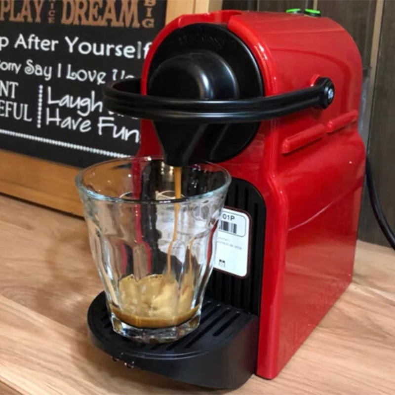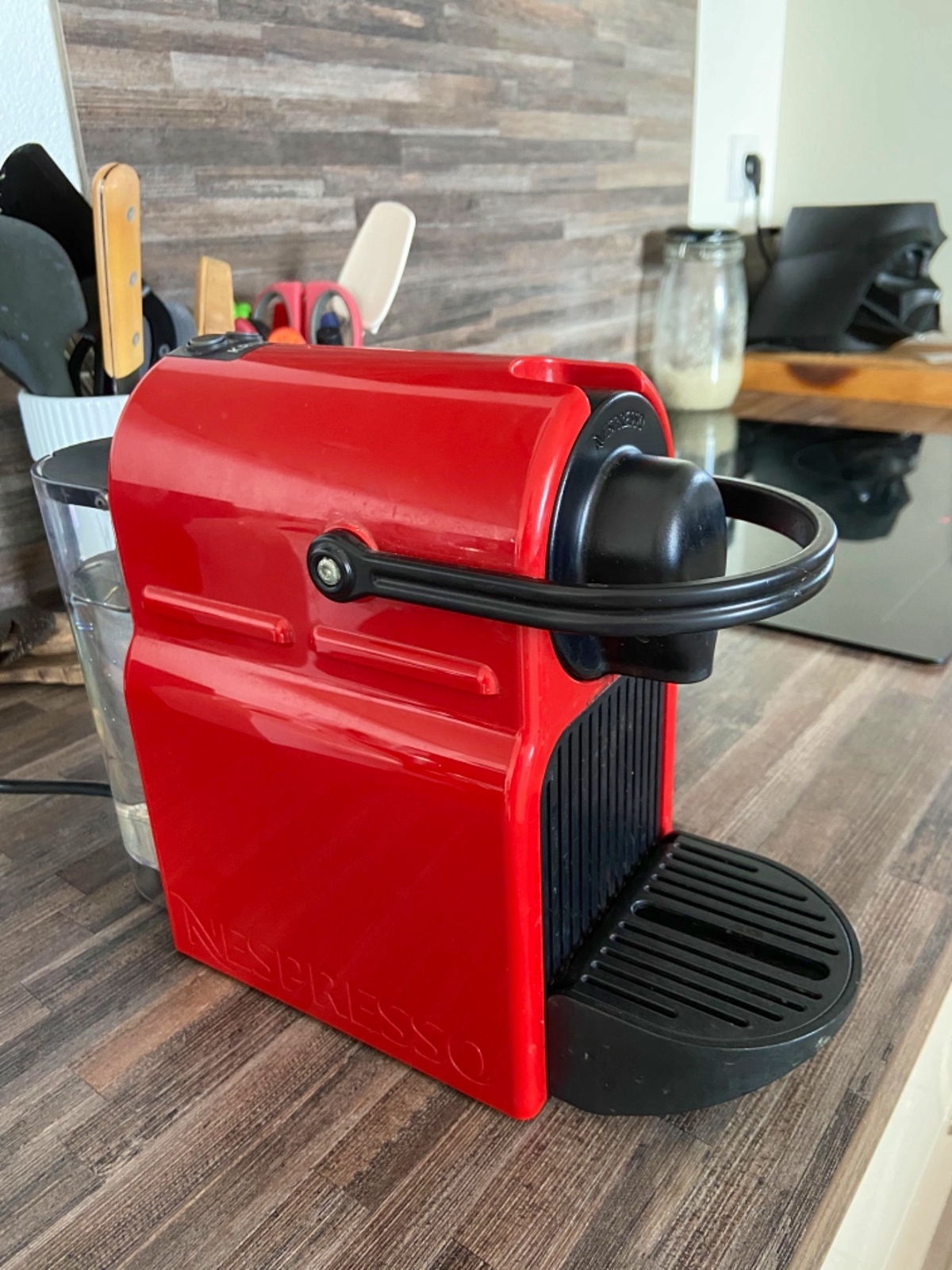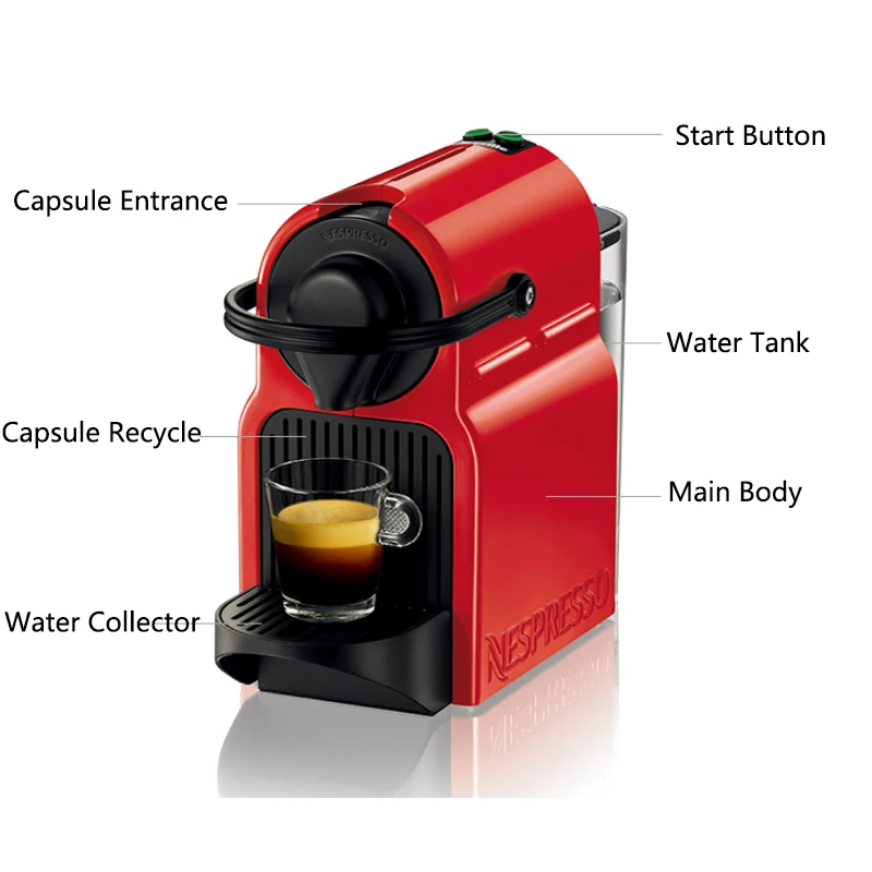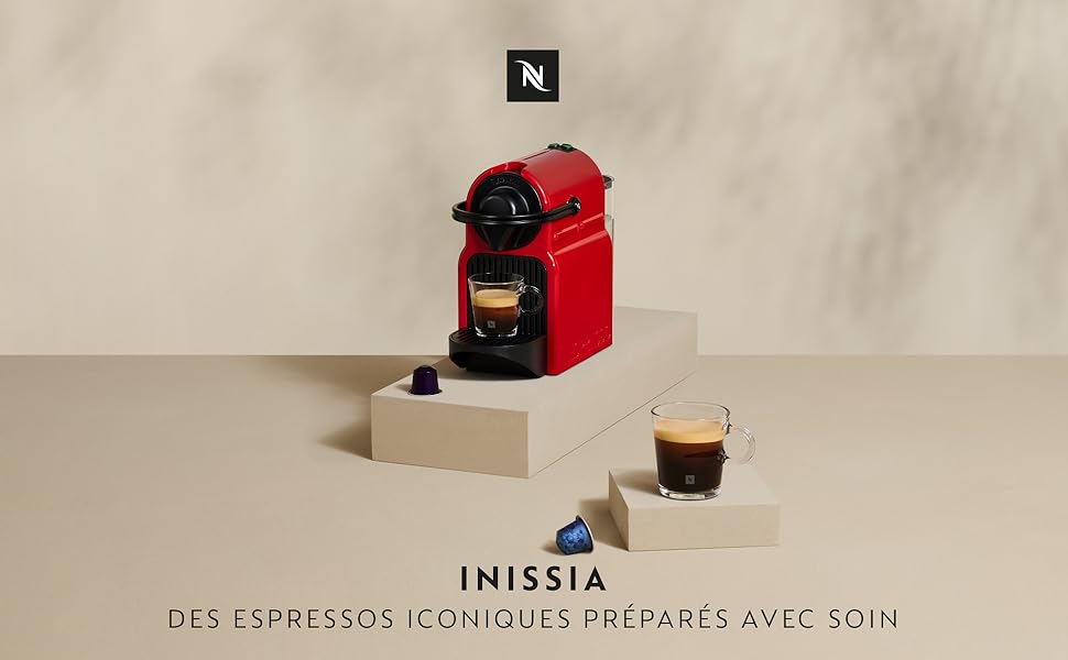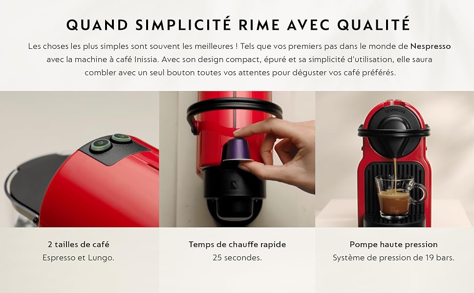 Type de machine : Expresso à capsule • Puissance : 1260 W. • couleur rouge • Compacte : largeur 12cm - Mise en veille automatique • Système : A pompe • Arrêt automatique : Oui • Mise en veille (économiseur d'énergie) : Oui • Pression : 19 bar • Capacité du réservoir :700mL • Réservoir amovible : Oui • Type de café : Capsule • Capsule : Nespresso et compatibles • Préparations : Espresso et Lungo • Longueurs de tasses multiples : Oui • Détartrage automatique : Oui. • Nombre de tasses préparées : 1 caracteristiques. • Système d'infusion offrant des réglages pour 2 tailles de tasse avec des boutons programmables pour un espresso ou un café allongé • La pompe haute pression de 19 bars produit une délicieuse mousse crémeuse qui couronne l'espresso • Préchauffage rapide en seulement 25 secondes • L'élément chauffant Thermoblock produit des doses d'espresso de qualité plus rapidement qu'une bouilloire • Arrêt automatique après 9 minutes • Appareil minuscule idéal pour les petits espaces et les comptoirs de cuisine limités • Conception légère pesant un peu plus de 5 lb • Insertion et éjection faciles des capsules • Plateau égouttoir rabattable pouvant accueillir de grands verres pour le café au lait • Inclut le moussoir à lait Aeroccino Plus, qui offre une préparation rapide en une touche pour faire mousser du lait chaud ou froid