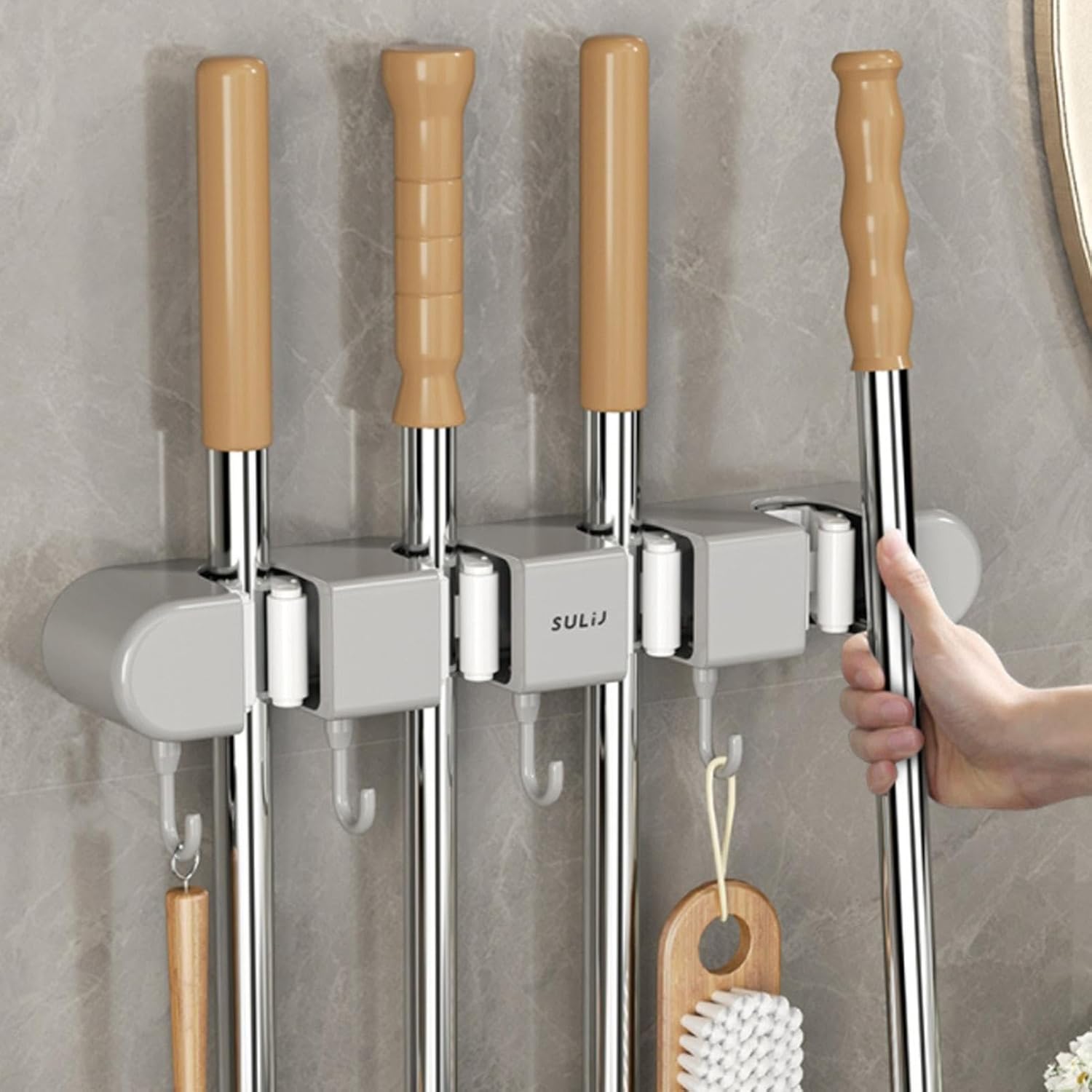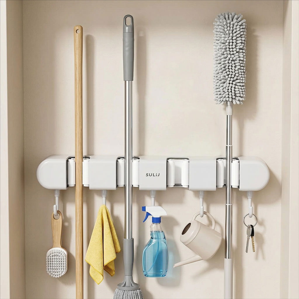 Support mural pour balai avec Crochets pour serpillière - حامل مكنسات التنظيف